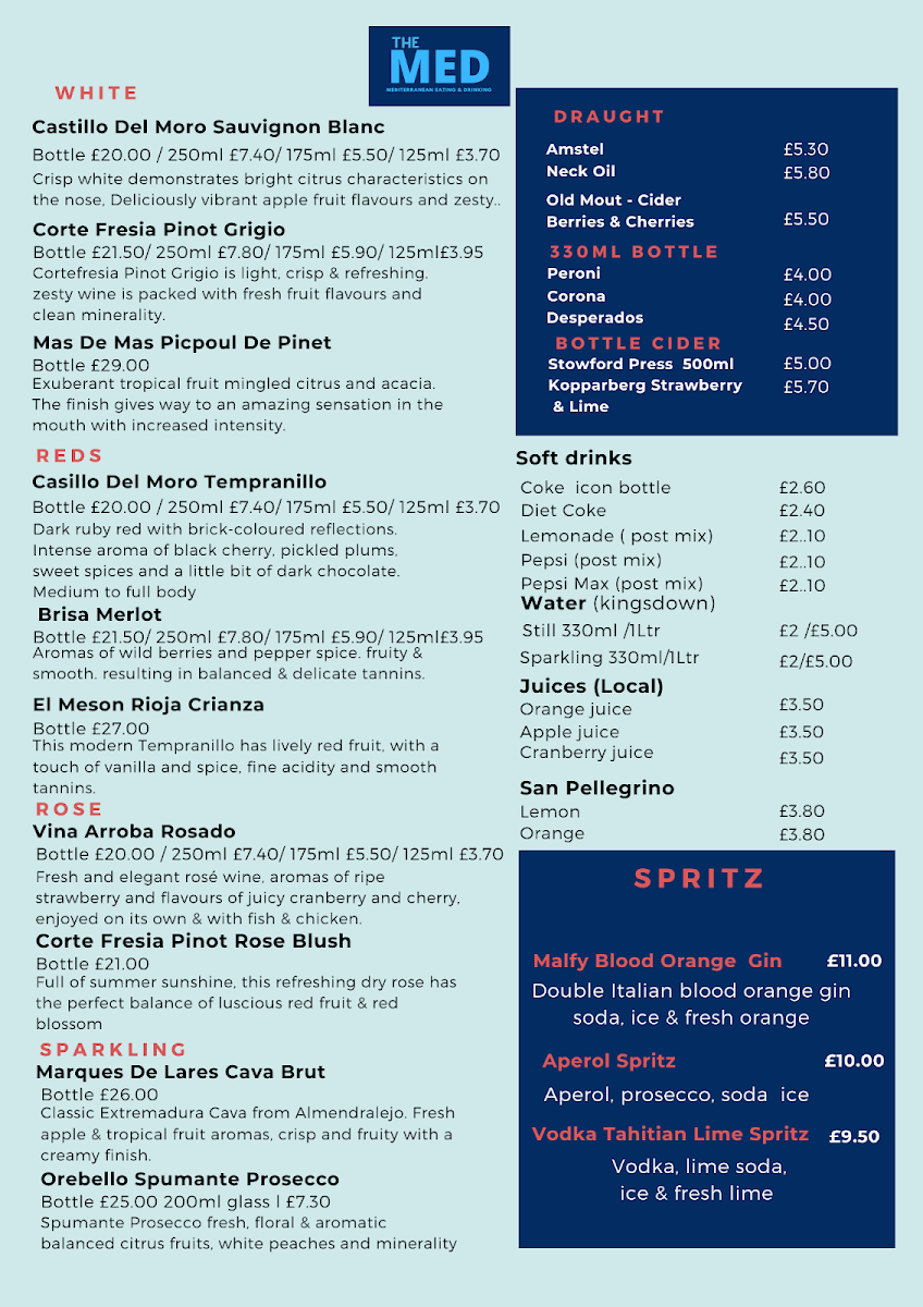 The Med isn't just about the food; it’s a family-friendly destination where guests feel seen and appreciated. Reviews highlight the exceptional service, with kind staff like Eleanor making each visit memorable. Portions are generous, and the ambience invites you to relax with a drink from their selection, including Peroni and Desperados.